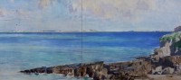 Oil painting: backdrop for the North Ronaldsay sheep display in Victorian Gallery at Stromness Museum. Painted by Stanley Cursiter. 1950s.