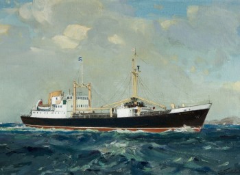 Oil painting of the St Rognvald III at sea by Leslie Arthur Wilcox.