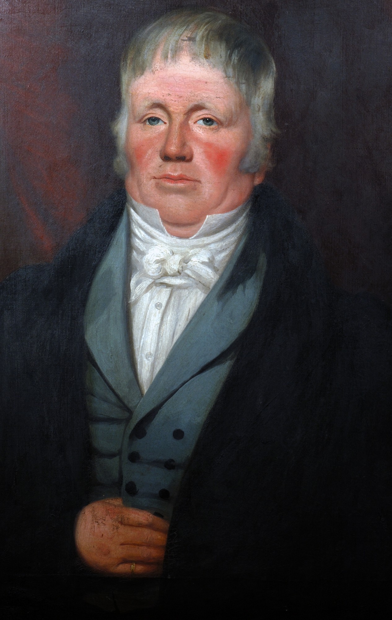 Unglazed oil on canvas portrait of Peter Brown, Bailie of Stromness 1833 - 37. Frame, mahogany veneer. Inscription on a silver plaque on front of painting very worn. " Presented ... to Peter Bichan Esq...Magistrate 1856" ?