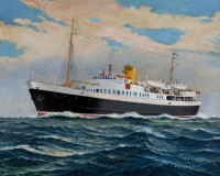 Oil painting of the St Rognvald III at sea by Leslie Arthur Wilcox.
