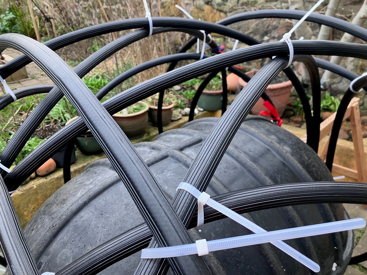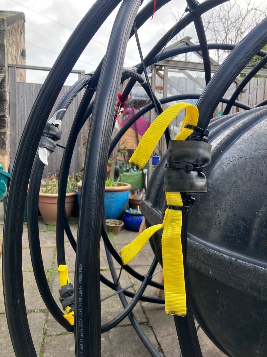 Jenny has decided to construct the floating part with a core of a large mussel buoy that she found on Isle of Lewis a few years ago. This is being wrapped in fibreglass rods and industrial hose pipe, and finally covered in painted sail cloth. She is paying attention to the construction, aware of the storms and strength of the waves and we will see how this experimental artwork fares in the coming months.